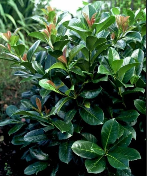 Stedsegrøn busk med store, blanke, friskgrønne blade. Nye blade bronzerøde, senere lidt mørkere, hvælvede og blanke.