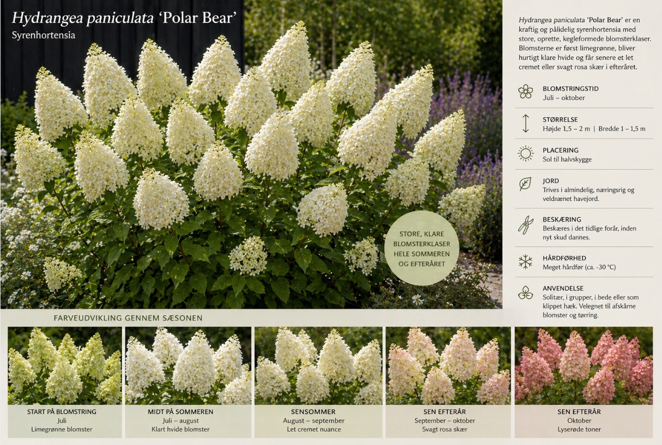 Hydrangea paniculata ‘Polar Bear’ er en meget populær syrenhortensia, som især udmærker sig ved sine store, rene hvide blomster og robuste vækst.