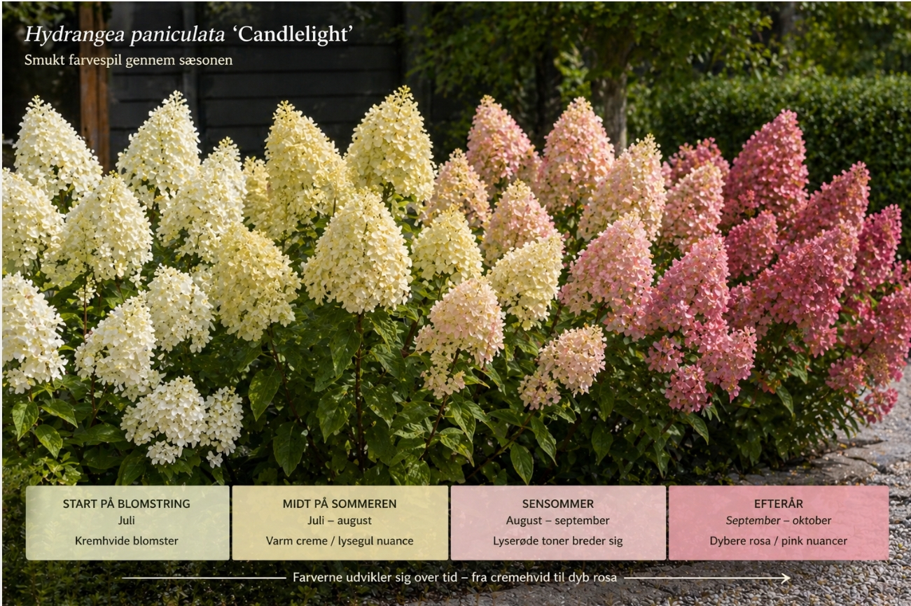Hydrangea paniculata ‘Candlelight’ er kendt for at give et flot farvespil – men ikke som flere farver på én gang i klassisk forstand. I stedet ændrer blomsterne farve i løbet af sæsonen.