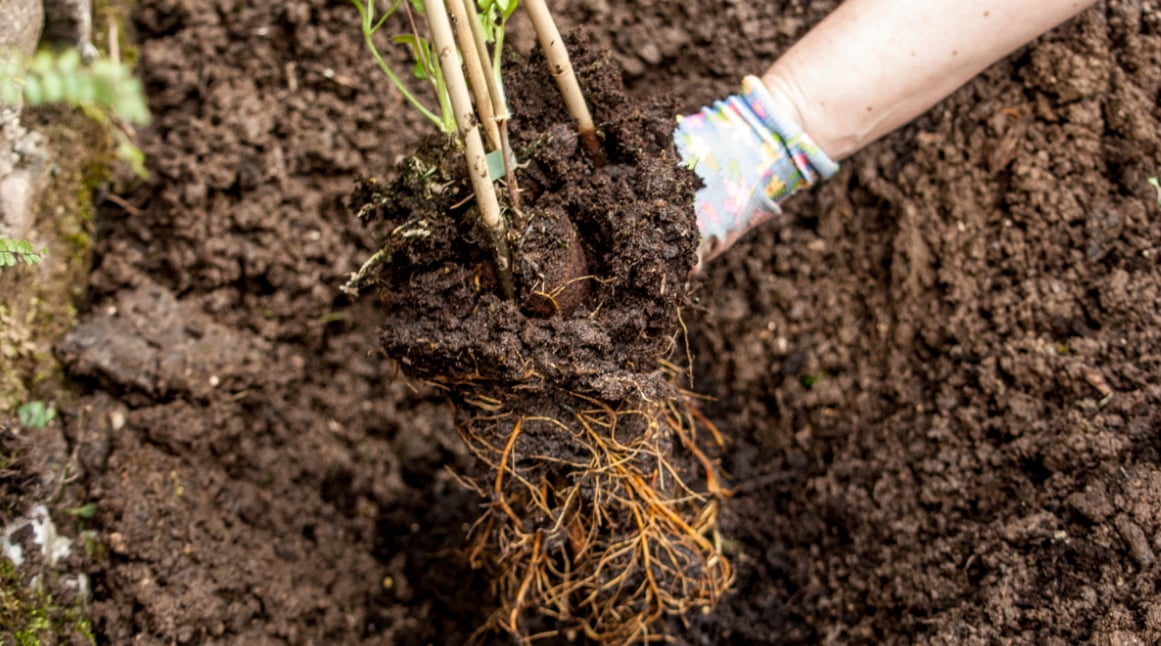 Grav et plantehul 40 -50 cm X 40-50 cm og ca. 50 cm dybt. Klematis elsker en let muldblandet jord. Har man ikke sådan en jord i sin have, kan man med fordel iblande den opgravede havejord ¼ kompost. Er den indkøbte potte med klematis tør, skal den sænkes ned i en spand med vand i ca. 15 min., så den bliver vandet godt op. Klematis har en sart rodhals, og det er derfor nødvendigt at afmontere potten lidt forsigtigt. Placér håndfladen på pottens top med fingrene omkring plantens rodhals. Vend potten på hovedet og lirk forsigtigt potten af potteklumpen. Nu kan planten sænkes ned i plantehullet. Vand godt til efter plantningen.